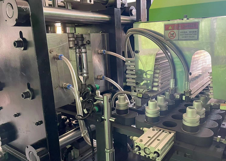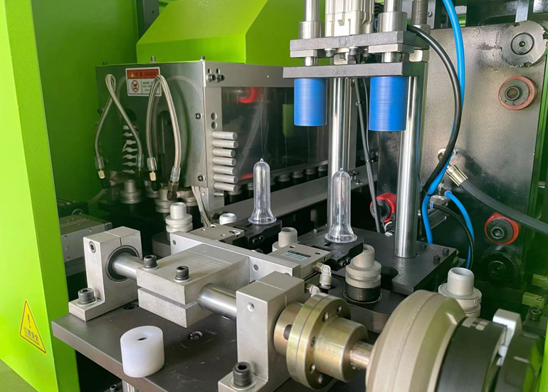 l瓶胚由上料機輸送到主機,再通過機械手精準(zhǔn)的將瓶胚插入胚座,再通過定位壓板及壓胚系統(tǒng)將瓶胚進行二次定位。